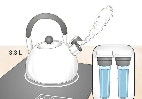 Bring 3.5 US quarts (3.3 L) of filtered water to a boil in a tea kettle. Pour the water into the kettle, then place the kettle over heat to boil the water. Use filtered water to ensure there’s no chlorine in it, since chlorine can harm the bacteria you need to ferment your tea later on. If your water isn’t filtered, the minerals in the water may also affect the flavor of your kombucha. This is the amount of water you should use for making kombucha in a 1 gallon (3.8 L) glass jar.