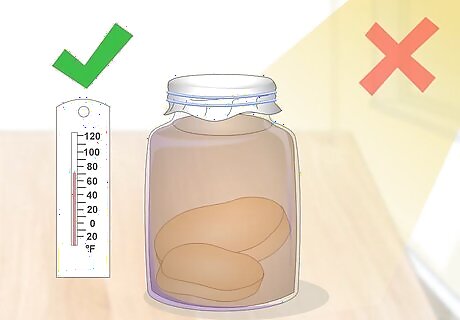 Place the jar in a room-temperature spot out of direct sunlight to brew. Keep the jar away from vents or other sources of fluctuating temperatures. Place it somewhere where it’s guaranteed to stay at a temperature of around 75 to 84 °F (24 to 29 °C) for up to 2 weeks. Leave the tea to brew for 7-14 days. Avoid putting your jar in a closet or cupboard, as it needs good airflow in order to brew.