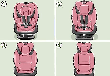 “Promote” your child to the next seat stage as slowly as possible. While both you and your child may be eager to ditch the 5-point harness for a simpler booster seat and seat belt, don’t be in a rush to make the switch. Whatever car seat stage they’re in, keep your child in that seat until their height or weight exceeds the maximum range printed on the seat and in its manual. Any child under 2 should be in a rear-facing, 5-point harness safety seat. Beyond age 2, keep them in the rear-facing seat until they exceed the seat’s posted height or weight range. Once you switch to a forward-facing, 5-point harness safety seat, keep the child in it until at least age 5 and until they meet the maximum height or weight range. If they reach either maximum before age 5, look for a seat model with higher maximums. After they grow out of the safety seat range, use a booster seat that utilizes the car’s seat belt until the child is at least 12 years old and 57 in (140 cm) tall (at which stage a standard seat belt should fit properly).