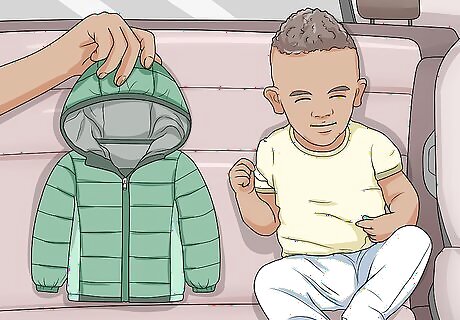 Remove bulky or obstructive clothing before strapping the child in. If you try to secure the harness over a bulky winter coat or blanket, the child may not be held securely during an accident. Instead, take off any bulky clothes, strap the child in, and cover them with the coat or blanket. For example, you can put a winter coat on backwards after buckling the child in. Make sure the child’s legs and crotch are unobstructed so you can secure the bottom buckle. Cover their legs with a blanket afterward if necessary.