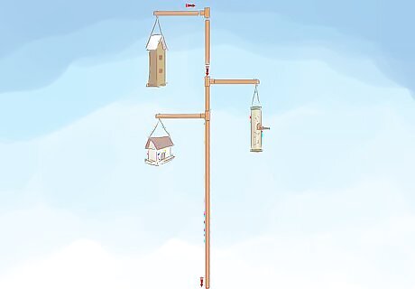 Decide how many "limbs" you want. (Remember that the more limbs, the more breaks you need in the main pole which will create more movement at the top. You also want to try to equalize the weight distribution of the feeders to each side of the pole so it does not lean over time.) You can decide to have three limbs, two at about 7 feet (2.1 m) and then another off the very top. From this point, you simply cut the main pipe at the height you want the first limb and attach a "T" fitting so you have the ability to add another pipe perpendicular to the main pole. Then add another length of pipe into the "T" fitting that will extend the main pole to the height of the second limb and repeat as desired.