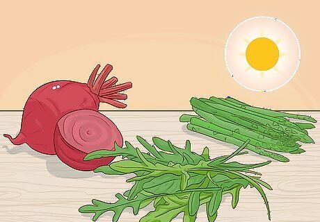 Pick up fresh beets, arugula, and asparagus early in the summer. Like many seasonal fruits, beets, arugula, and asparagus are only in season for a limited time across most climates. While there are some variations depending on where you live, in most places, beets, arugula, and asparagus are in season and freshest in the early summer. Try slicing and roasting beets to make a healthy batch of beet chips, or serving them with goat cheese and honey for a summer-ready sweet and savory snack.