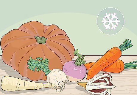 Buy in season root vegetables in the winter. While many root vegetables are grown all year round, there are several that reach their peak season during the winter, including winter squash, celeriac, carrots, turnips, parsnips, and Tardivo radicchio. Most of these vegetables are grown in cooler climates, making them a great in season option if you live farther north. Many of these in season root vegetables can be used to make delicious, winter-friendly soups.