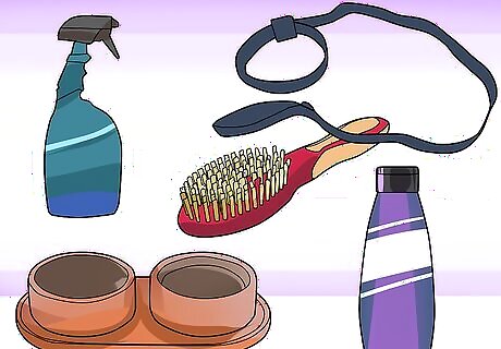 Have the supplies you'll need ready. You'll need the obvious items, like food and water bowls, food, a leash, and a collar. You'll also need things like an ID tag for the dog (with your information on it), brushes and shampoos (to groom the dog), and an enzymatic cleaner (to clean up after the dog). If possible, talk to the previous owner or shelter about what food the dog was on. It's best to keep the dog on it, at least for a little while.