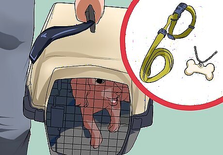 Take the dog home from the shelter or home. When you go to pick the dog up, you'll need to have several things on hand just in case, including the leash, tag, collar, and carrier. A dog travels best in a carrier at least at first. Also, the tag and collar are important in case the dog somehow escapes while in transit. For safety reasons, it is important to keep your dog on a leash when you are outside (unless you are in a dog secure fenced-in area). Do this until you are certain the dog will not run away from you.