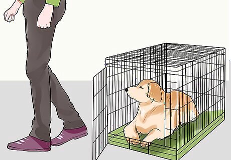 Crate train your dog. Have the crate ready with a blanket in it when your dog gets home. Show the dog the crate, talking in an encouraging voice. To help the dog get used to the idea, place some treats inside the crate. Keep using treats to get the dog to go inside. You can use a toy if that's more motivating for the dog. Next, try feeding the dog in the crate. Wait a week or so before you start this process. Place the food bowl as far in as the dog will go. If the dog goes all the way in, try closing the door just while it's eating. Each time you feed the dog, close the door a bit longer. Teach them a command for the crate. You can use whatever command you want, such as "kennel," "bed," or "crate," as long as you are consistent. Use a treat to call the dog over, saying the command word. Get them to enter the crate with the treat, then give them the treat. Close the door, and sit with the dog for about 10 minutes. After a few minutes, leave the room for a bit. Once your dog can do this step for about half an hour without you in the room (without getting anxious), you can start leaving the dog alone in the house for short periods in the crate. After that, you can try crating at night. It may help to start the dog in the same room as you.