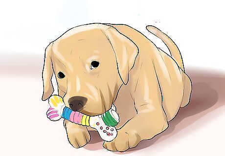 Provide chew toys. When your dog first gets to your house, it may want to chew on household items that you don't want destroyed. Providing solid chew toys gives the dog something to chew on, providing a safe, healthy distraction from your household items.