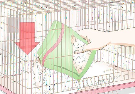 Give your rabbit comfortable bedding. Comfortable bedding is essential for your disabled rabbit. Provide him with multiple layers of bedding. The bottom layer should be something thick and absorbable, such as a small area rug or bath mat with a rubber bottom. This layer keeps the floor from getting wet and provides extra cushion. The next layer should consist of some padding, such as disposable puppy pee pads, to absorb moisture. Washable pet pee pads are also available. Make sure the pads are fragrance free. Place several white towels on top of the padding to absorb moisture. The white color allows you to see when your rabbit goes to the bathroom. The very top bedding layer should be a synthetic wool or fleece, which will wick away wetness and provide your rabbit with some warmth and orthopedic support. Synthetic sheepskin is also effective at wicking away moisture. For the items that are washable, keep a large supply so you can still maintain your rabbit’s bedding while washing what has become soiled.