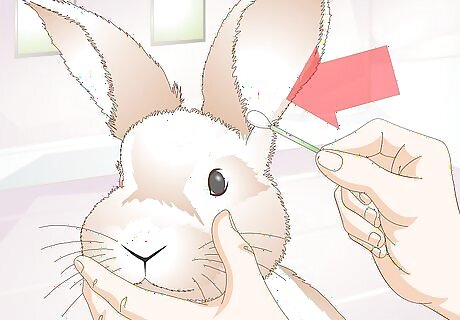 Clean your rabbit’s ears. Since your rabbit’s disability might make it difficult for him to clean his ears, you will also need to do this for him. You will need a few long-stemmed cotton swabs. Lightly dampen a swab with warm water and gently rub it around the inner part of his ear, focusing on areas where there is wax buildup. Use a gentle sweeping or scooping motion to get the wax out of the ear. Do not push the swab so far down in his ear that you cannot see the tip. This can push wax further down his ear, and possibly damage his eardrum.