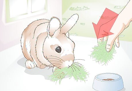 Feed your disabled rabbit a balanced diet. A balanced diet is important to the health of any rabbit, but even more so for the health of a disabled rabbit. Your rabbit’s disability may have a negative effect on his weight and health, so he will need a constant supply of healthy food. Components of a healthy diet include hay, pellets, vegetables and fruit. Feed your rabbit an unlimited amount of fresh, high-quality hay. For disabled rabbits, hay’s high fiber content helps prevent digestive problems like gastrointestinal stasis. Of the different types of hay (e.g., timothy, alfalfa, orchard grass) alfalfa is great for disabled rabbits because it has a sweet taste and helps with weight gain. Select high-quality rabbit pellets. The pellets should about at least 20% fiber, 12 to 14% protein, and 1 to 1.5% fat. Alfalfa-based pellets are tasty and high in protein, which makes them ideal for disabled rabbits. Vegetables not only provide important nutrients, but also provide moisture that is important for bladder and kidney health in disabled rabbits. Fruits, although high in sugar, can be good if your disabled rabbit needs to gain weight. Fruits can cause digestive upset, so add them to his diet very slowly and watch for diarrhea. Provide your disabled rabbit with unlimited access to fresh, clean water.