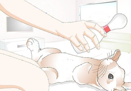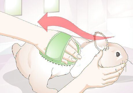 Groom your rabbit daily. In addition to keeping your disabled rabbit clean, you will also need to keep his coat healthy and free of tangles and mats. It is best to brush your rabbit every day. If you do not have one already, purchase a basic pet comb at your local pet store. Position your rabbit comfortably in your lap and comb him gently from front to back. Carefully use the comb around your rabbit’s eyes. Part of grooming your rabbit involves cleaning his scent glands, which are located near his genitals. To find them, look for two slits on either side of his anus. Use a Q-tip moistened with either petroleum jelly or warm water to gently swab away any build up or discharge. It will be easier to clean his scent glands when he is on his back, so you will want someone to help you with this. Do not groom your disabled rabbit’s feet, since they are very sensitive.