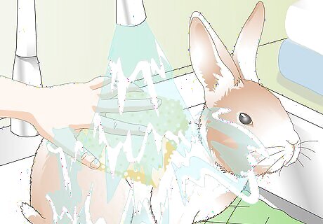 Bathe your disabled rabbit as needed. Although healthy rabbits rarely need baths, your disabled rabbit will have trouble grooming himself and keeping himself clean. He may get urine, feces, or food stuck in his fur, and will probably get stinky from time to time. Your rabbit will appreciate your time and effort to keep him clean. To give your disabled rabbit some traction during the bath, place a rubber mat in the bottom of a sink or tub. Place about one inch (2.5 cm) of lukewarm water in the sink or tub and gently lower him in hind end first. Use rabbit-specific shampoo to wash only the dirty area (most likely his hind end). You may want to wear some gloves so you do not come into direct contact with your rabbit’s urine or feces. Baths can be stressful for rabbits, so talk to your rabbit in a soothing voice to keep him calm during the bath. You can also feed him treats. Rinse and dry him off completely. If your veterinarian has prescribed an ointment or cream for your rabbit’s skin, apply it to your rabbit’s bottom to prevent it from becoming raw or infected.