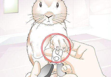Trim your disabled rabbit’s nails. Rabbit nails can become very long if not trimmed regularly. About once a week, check your rabbit’s nails and trim them if they are looking a little long. Trimming a rabbit’s nails usually takes two people, but, since your rabbit probably cannot move around very much, you may be able to trim his nails on your own. To trim his nails, you will need a pair of pet-specific clippers (guillotine style, preferably) and some styptic powder to stop any bleeding. Cornstarch can be used instead of styptic powder. Before clipping, find the quick, which is the blood vessel running through each nail. Trim a little bit at a time to just above the quick. If you cut the quick on accident, dab the nail in the styptic powder or cornstarch. Take your rabbit to your veterinarian if you are not comfortable trimming the nails.