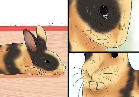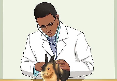 Notice signs of ill health. Despite you taking care of your rabbit, he may still become ill. To help take care of him, you need to watch your rabbit closely in case he shows signs of sickness. If you notice any, you need to take him to the vet. These signs include: Discharge from his nasal passage or eyes Drooling or unnecessary wetness around his mouth Reduction or loss of appetite and water drinking Skin redness, swelling, or fur loss Loss of mobility in his back legs Inability or avoidance of hopping Diarrhea Not going to the bathroom for at least a day Red or dark urine Running a temperature over 105 °F