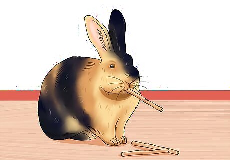 Provide him with chew toys. Your rabbit will need something to chew on at all times. If he doesn't, he will start chewing everything around him, including your electrical wires, walls, furniture, and carpet. Look for twigs or branches from apple, willow, or aspen trees. These are great for your rabbit. You can also buy him alfalfa cubes, untreated pine boards, hay, or cotton towels.
