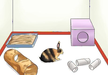 Set up a play room. Your Harlequin rabbit is an intellectual and inquisitive animal that needs plenty of places play and things to interact with. This means making him a large play area where he can run around. In a room you have already rabbit proofed, set up a large series of boxes and tubes of different sizes as a playground for you rabbit. He needs at least four hours of exercise every day to be happy and healthy. Make sure to include some steady surfaces with stairs in between the boxes where he can stand or climb. Wrapping paper tubes or paper towel rolls are good for your rabbit to play in and with