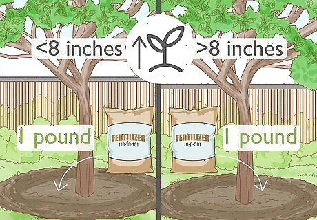 Choose your fertilizer type and amount based on the tree’s growth rate. If your tree has grown less than 8 inches over the past year, then you should apply 1 pound of a general 10-10-10 fertilizer. If your trees are posting more than 8 inches of growth, 1 pound of a sulfate-based 0-0-50 fertilizer is usually a better option. A 10-10-10 fertilizer contains 10% potassium, 10% phosphorous, and 10% nitrogen. The 10-10-10 fertilizer should be applied in early May, whereas the 0-0-50 fertilizer should be applied in early spring. Avoid fertilizing your trees after July 1st.