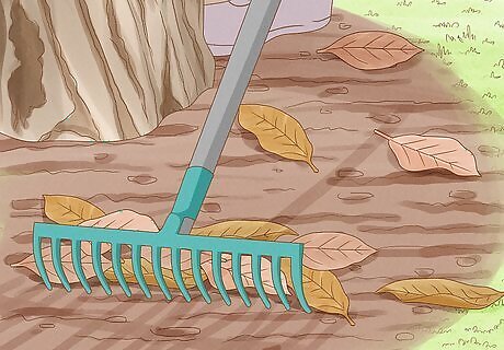 Rake any debris out from under the tree prior to fertilizing. Get a rake and remove any leaves, sticks, or fallen apples. As a general rule, do your best to keep leaves away from your tree as they can easily spread illnesses into the trunk. Creating a clean area also helps the fertilizer to absorb more effectively into the dirt.