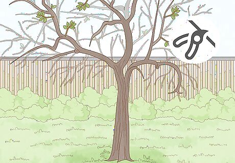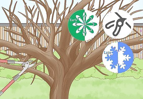 Complete your pruning in the late winter or early spring. Pruning your trees when they are dormant during the cool months gives them ample time to recover before they begin to bud in the spring. It also makes it less likely that pests will enter from the pruning cuts that you’ve made. Avoid pruning in the summer months, if at all possible.