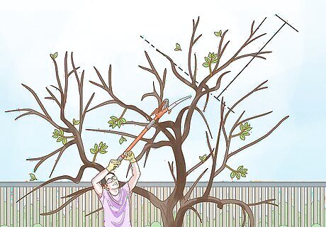 Cut away tall branches at the top of the canopy. Ideally, your tallest riser branches should reach a maximum height of 18 feet (5.5m). Use a pole saw to safely remove these branches. Cutting out entire large branches from the upper half of the canopy allows light to penetrate into the tree’s interior.