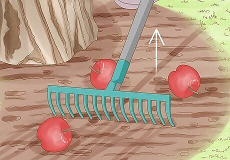 Remove all dropped fruit immediately. Make a habit of policing and raking the space under your apple trees regularly when they are bearing fruit. Pick up and dispose of any fruit that has fallen off of the tree. This will help to minimize the chance that pests will be drawn to your trees by the tasty treats on the ground.