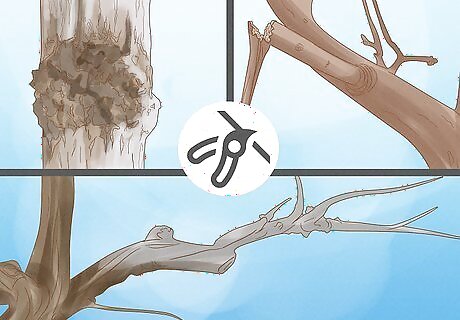 Remove any broken, dead, or diseased branches. Look over your tree and use hand pruners to cut away any smaller problem branches. For larger limbs, you may need to stand on a ladder and cut these away using lopping shears or a pruning saw. Target those branches that are off in color or appear to be cracking or losing their bark.