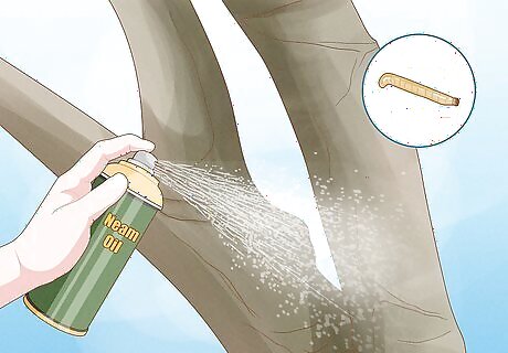 Spray your trees with neem oil to kill off borer insects. It’s best to prevent a borer infestation, which is difficult to detect and can easily kill your trees. Buy neem oil at your local gardening store and spray it liberally over the trunks of your trees. Repeat this process when your tree’s buds are green, when they turn pink, and after their petals fall away. You can also purchase chemical pesticides that contain neem oil, such as Neemix. If you intend to eat your apples, avoid using toxic or chemical-laden pesticides. Always wash your apples before eating them.