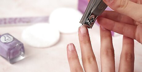 Trim your nails straight across. This will help you avoid ingrown nails. Also, try to cut your nails right after you’ve showered or bathed so that the nails are softer. If you’d like to soften the corners or edges of your nails, use a nail file or emery board. File in a consistent direction to prevent weakening your nails. Filing back and forth severely damages nails over time. Disinfect your nail care tools monthly in 70 percent or stronger isopropyl alcohol. To maintain nail flexibility and prevent nail splits, moisturize your nails after trimming them.