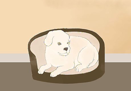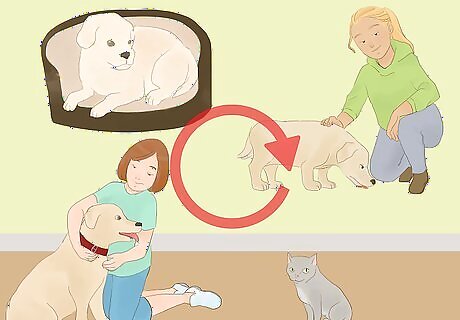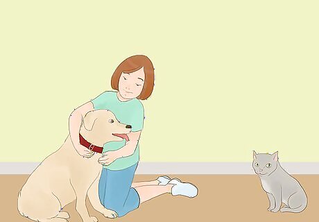 Remove your dog to a safe place each time it misbehaves. If your pooch growls, barks, and/or lunges at the cat, immediately remove your dog from the room. It’s best to do so calmly but firmly and to bring your dog to a safe space like their bed or crate to reset their behavior. Once they’ve settled down, lead them back to the room with the cat to face it again. They will only learn to not react through repetition. Do not react negatively or punish your dog for their bad behavior. It will only make them more agitated and could make their behavior worse rather than better.