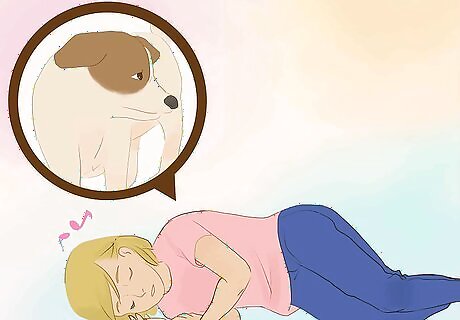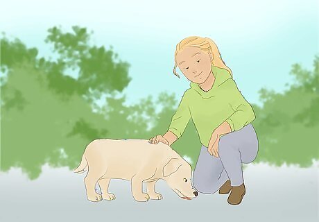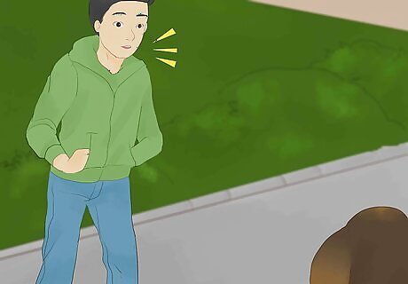 Drop to the ground, and make strange noises. Since your dog is distracted, you want to re-distract them away from whatever they’re chasing. If you behave in a manner that is strikingly out of the ordinary, you will not only recapture their attention but also encourage their immediate return to investigate what’s going on. Dropping to the ground is unusual behavior for humans. When you pair that action with an unfamiliar noise, like singing or sobbing, your dog will take note and be curious enough to find out what you’re doing. Stay on the ground avoiding eye contact with your dog until your pooch is right next to you. Don’t make any sudden motions to capture them, since that might scare them away. Just calmly reach out, and grab their collar when they’re within reach.