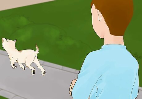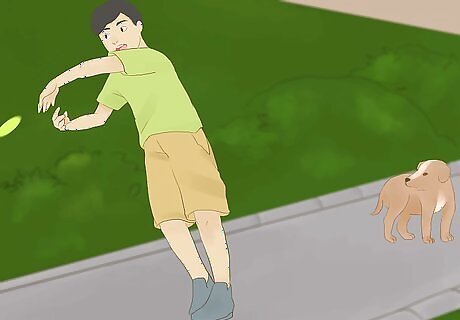 Throw something interesting on the ground. Try re-routing your dog’s chase by giving them something more fascinating to investigate. Call their name and throw something in a direction that will steer their path away from whatever they’re chasing. If you have a ball, frisbee, or other toy on hand, try throwing that to engage your dog in a game of catch or fetch. If you don’t have an obvious thing to throw, improvise by throwing their leash, your jacket, or a nearby stick or rock.