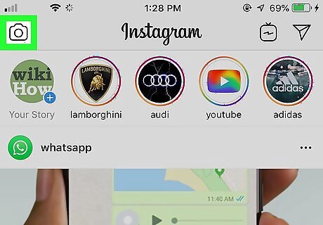 Tap the camera icon on the top-left. This button is in the upper-left corner of your Home feed. It will open your camera screen. If the app opens up to a different tab, tap the tiny house icon on the bottom-left to open your Home feed. Alternatively, swipe right on the Home feed to open the camera screen.