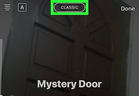 Tap the font name at the top of your screen. Your current font name is listed at the top of your screen. Tapping on the font name here will change your text to one of the other available fonts. Available fonts include CLASSIC, MODERN, NEON, TYPEWRITER, and STRONG.