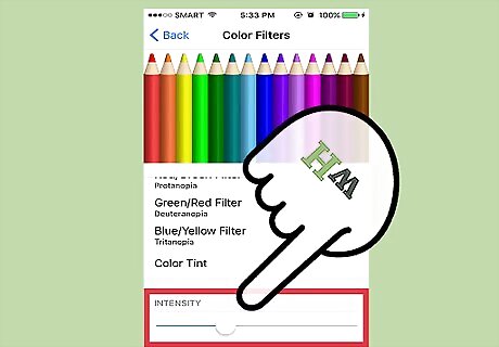 Swipe the color slider right or left. It's at the bottom of the screen. Swiping to the left increases your filter's intensity, while swiping to the right decreases it.