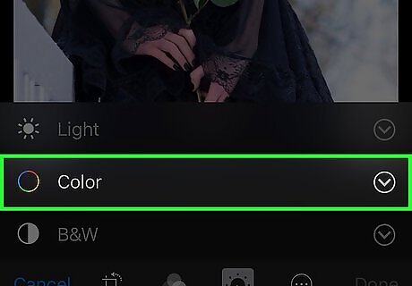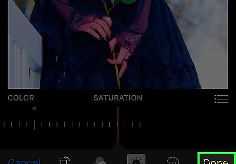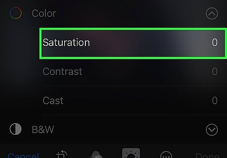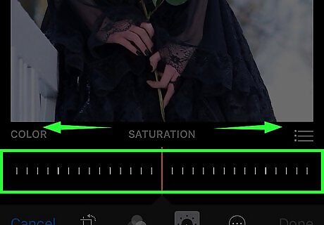 Swipe the slider left or right. The slider at the bottom of the screen controls the saturation of your selected photo. Dragging it left will increase the photo's color intensity, while dragging it right will decrease the intensity.