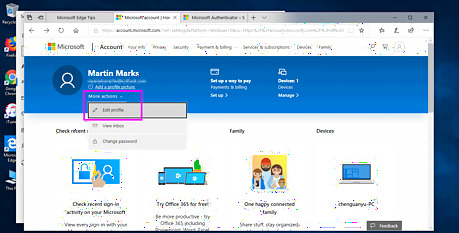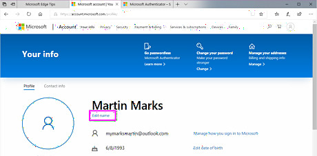 Sign into your Microsoft account in the browser. Click on More actions, and then select Edit profile. If it is the first time you’ve logged in with your Microsoft account you may need to enter your Microsoft account and password to sign into microsoft.com.