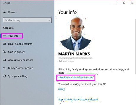 Click on Your info in the left panel. Then click on Manage my Microsoft account on the right panel.