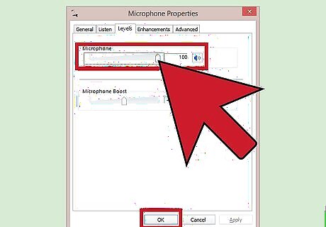 Drag the microphone slider to the right. You may notice two different sliders: "Microphone" and "Microphone boost." Go to the "Microphone" slider, and move the arrow to the right, until the number "100" shows up in the box beside it. Click "Okay" to return to the sound pop-up.