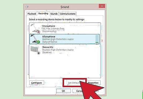 Select "Set as default device" to change the microphone. This will now be your active microphone. You can also select "Set as default communication device." This means that you'll only be able to use the microphone to chat with other people in programs, such as Skype and video games. If you want to make recordings on your computer, then select "Set as default device."
