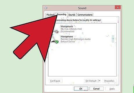 Make sure that the "Recording" tab is open. There will be several tabs along the top of the Sounds pop-up, including: "Playback," "Recording," "Sounds," and "Communications."