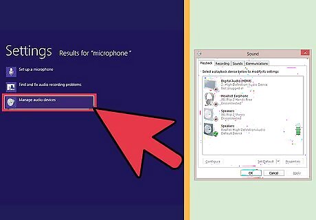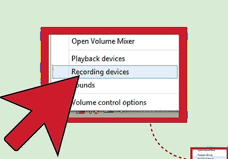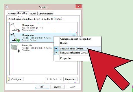 Find the microphone that you want to use. You may have only one microphone showing, or you may have several. If the microphone you want to use is not showing up in the list, try one of the following: Make sure that the microphone you want to use is plugged in, and that it's in the correct jack socket. The color of the socket may vary; it should have an icon of a microphone right next to it. If you are on a laptop, you will likely have a microphone already built into your computer; however, you can still plug in a higher-quality one. Right-click one of the microphones from the list, and make sure that the "Show disabled devices" is checked. This should bring up all of the microphones available.