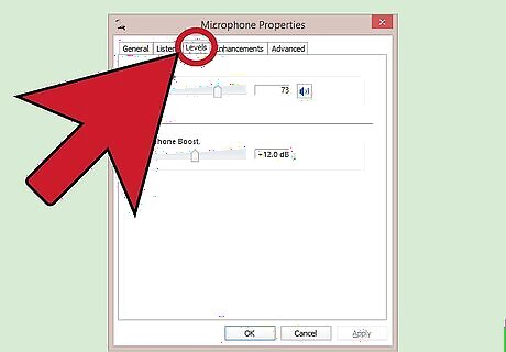 Make sure that the "Levels" tab is selected. When you bring up the "Microphone properties" pop-up, you will notice several tabs along the top, including: "General," "Listen," and "Levels." Make sure that "Levels" is selected.
