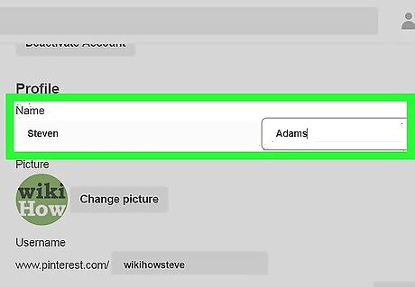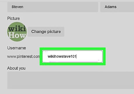 Type a new username into the “Username” box. It’s the box that immediately follows “www.pinterest.com/”. Click your mouse at the end of the username, press ← Backspace or Delete to erase what’s there, then enter your new username.