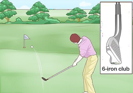 Use a 6-iron for low-terrain chip shots. If you need to chip the ball over low terrain, a 6-iron is the best club to use. A ball hit by a 6-iron will roll a lot after they land, so you’ll want your ball to land 10–30 yards (9.1–27.4 m) away from the intended target. If you try to chip shot with a 6-iron too close to the hole, it may roll past the hole. The amount that the ball rolls after it lands will depend on how hard you hit the ball.