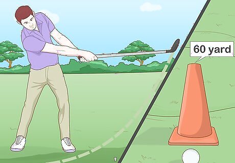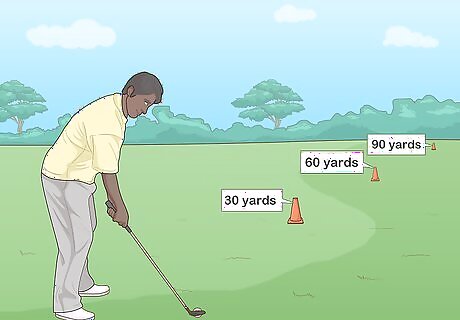 Set up indicators 30, 60 and 90 yd (27, 55 and 82 m) away. Find an area where you can set up cones or ribbons to indicate 30, 60 and 90 yd (27, 55 and 82 m). Set up the markers somewhere off the golfing green. Use these indicators to practice hitting balls a specific distance. You can also set up a practice range in your backyard if you don’t have access to a golf course.