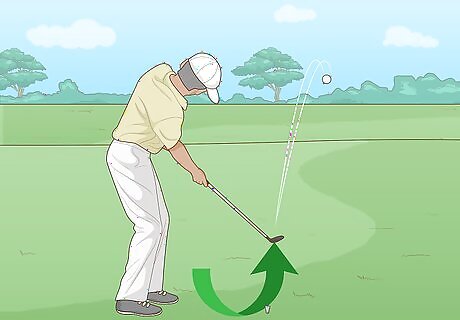 Swing the club forward and hit the ball. Swing the club in a slightly downward direction. Hit the ball before the club makes contact with the grass for a clean shot. If done correctly, the ball should jump up over whatever obstruction is in your way. It’s normal for the club to hit the grass after it hits the ball. It may take several tries before you make contact with the ball.