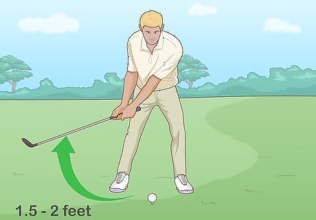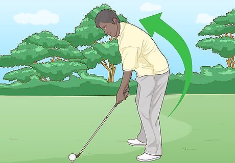 Bring the club up behind you. Bend your non-dominant wrist and your back arm slightly at the elbow while you bring the club back. Keep your leading arm as straight as possible while you swing the club in the backward motion. For chip shots, you’ll only need to bring the club back 1.5–2 ft (0.46–0.61 m). Don’t bring the club too far back or you’ll hit the ball too hard and the direction will be unpredictable.
