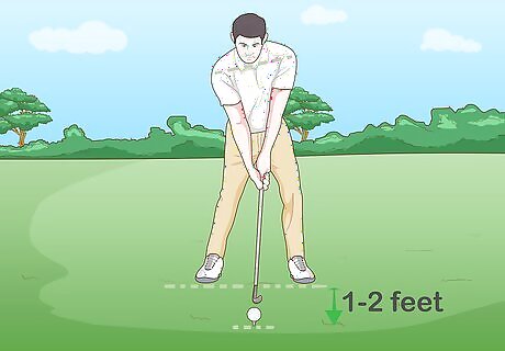 Plant your feet on the ground with your toes facing the golf tee. Stand 1–2 ft (0.30–0.61 m) away from the golf tee. Position your feet so that they are parallel with each other and square your shoulders. Hold the handle on your club firmly with both hands and angle the club out in front of you. You should feel comfortable and natural.