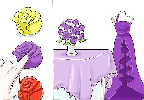 Choose colors that harmonize with your wedding. Consider the overall color scheme of your wedding, including any other flowers you are using, the color of the bridesmaids' dresses, and the color of the table linens that the centerpieces will be presented over. You don't need to exactly match the centerpiece to any of these colors, as long as you use colors that compliment each other. For instance, you may choose to have pastel blooms in your centerpiece if your wedding features other pastel colors. If you have a fall theme for your wedding, you may choose to have a centerpiece that has deep, dark colors along with white or off-white flowers. Don't use only one color throughout your wedding. It's best to use a few colors that harmonize with each other rather than only one color. Using colors that compliment each other helps to bring out each color's beauty and makes for more interesting visuals.
