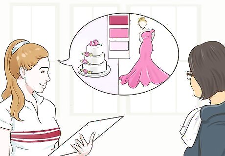 Communicate your ideas with your florist or designer. Once you have made your decision, meet with your florist or wedding designer to talk about your ideas and to get input. Bring the mood board you created, along with any items that may give you some kind of inspiration. Give your designer the details of your wedding, including the kind of venue at which is taking place, the size of the wedding, the colors of the bridesmaids dresses along with the other colors that you envision being the most prominent in the space of the reception. Show your designer your mood board and tell them about any ideas that you may have at this stage. Then pick out a centerpiece with the help of your florist by both matching the arrangement with the rest of your wedding and taking into mind what arrangements are practical in terms of your wedding.